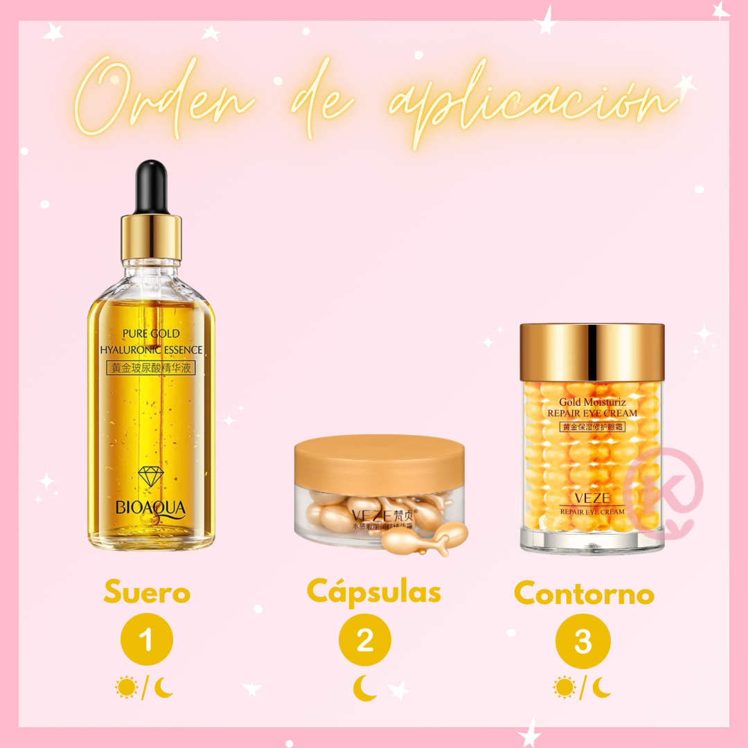AM: Limpieza → Suero 24K → Crema → Protector solar. Contorno: aplicar una pequeña cantidad.